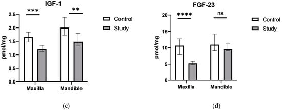 The concentration of: (a) Human parathyroid hormone-related protein (PTHrP); (b) Platelet-Derived Growth Factor AA (PDGF-AA); (c) Insulin-like Growth Factor 1 (IGF1); (d) Fibroblast Growth Factor 23 (FGF-23) in the periostea of the maxilla and mandible of the two study groups. Values are medians (interquartile range), and the differences between the groups were compared by the Mann–Whitney U test; ns p> 0.05; ** p ≤ 0.01, *** p ≤ 0.001, **** p ≤ 0.0001 indicate significant differences from the controls.