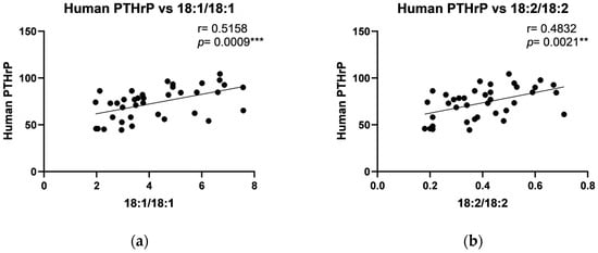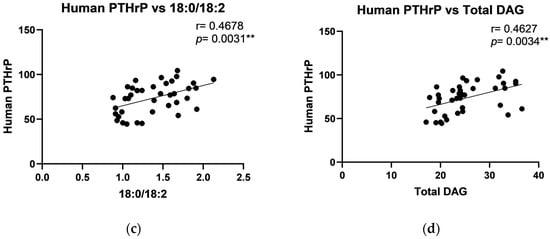 Correlations between the human parathyroid hormone-related protein (PTHrP) and particular diacylglycerols: (a) C18:1/18:1; (b) C18:2/18:2; (c) C18:0/18:2; (d) Total DAG in the periosteum of the maxilla. The data are presented as Pearson correlation coefficients; statistical significance: ** p ≤ 0.01, *** p ≤ 0.001. p-Value—probability, r—correlation coefficient.