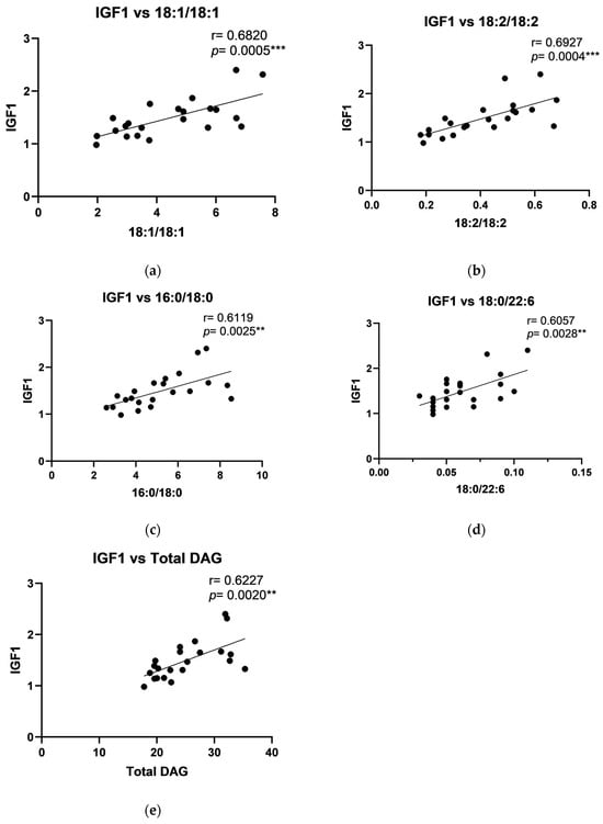 Correlations between Insulin-like Growth Factor 1 (IGF1) and particular diacylglycerols: (a) C18:1/18:1; (b) C18:2/18:2; (c) C16:0/18:0; (d) C18:0/22:6; (e) Total DAG in the periosteum of the maxilla. The data are presented as Pearson correlation coefficients; statistical significance: ** p ≤ 0.01, *** p ≤ 0.001. p-Value—probability, r—correlation coefficient.