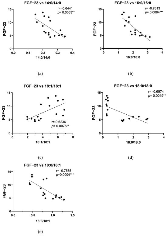 Correlations between Fibroblast Growth Factor 23 (FGF-23) and particular diacylglycerols: (a) C14:0/14:0; (b) C16:0/16:0; (c) C18:1/18:1; (d) C18:0/18:0; (e) C18:0/18:1 in the periosteum of the maxilla. The data are presented as Pearson correlation coefficients; statistical significance: ** p ≤ 0.01, *** p ≤ 0.001. p-Value—probability, r—correlation coefficient.