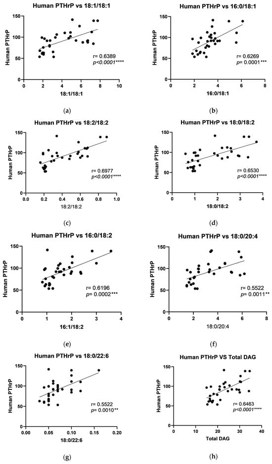 Correlations between the human parathyroid hormone-related protein (PTHrP) and particular diacylglycerols: (a) C18:1/18:1; (b) C16:0/ C18:1; (c) C18:2/18:2; (d) C16:0/C18:2; (e) C18:0/22:4; (f) C18:0/22:6; (g) C18:2/18:2; (h) Total DAG in the periosteum of the mandible. The data are presented as Pearson correlation coefficients; statistical significance: ** p ≤ 0.01, *** p ≤ 0.001, **** p ≤ 0.0001. p-Value—probability, r—correlation coefficient.