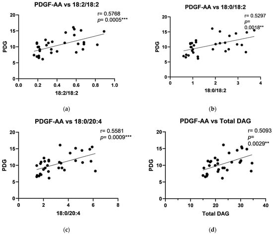 Correlations between Platelet-Derived Growth Factor AA (PDGF-AA) and particular diacylglycerols: (a) C18:2/18:2; (b) C18:0/ C18:2; (c) C18:0/20:4; (d) Total DAG in the periosteum of the mandible. The data are presented as Pearson correlation coefficients; statistical significance: ** p ≤ 0.01, *** p ≤ 0.001. p-Value—probability, r—correlation coefficient.