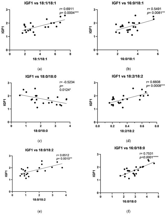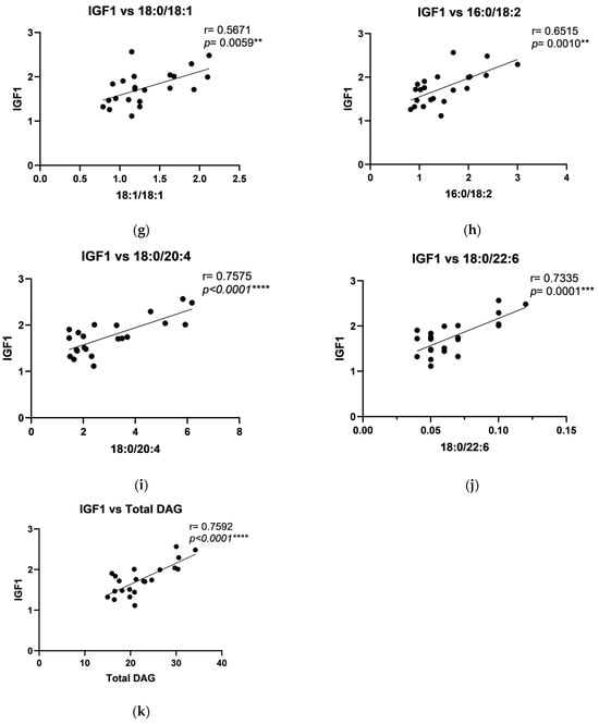 Correlations between Insulin-like Growth Factor 1 (IGF1) and particular diacylglycerols: (a) C18:1/18:1; (b) C16:0/C18:1; (c) C18:0/18:0; (d) C18:2/18:2; (e) C18:0/18:2; (f) C16:0/C18:0; (g) C18:0/18:1; (h) C16:0/C18:2; (i) C18:0/20:4; (j) C18:0/22:6; (k) Total DAG in the periosteum of the mandible. The data are presented as Pearson correlation coefficients; statistical significance: * p ≤ 0.05, ** p ≤ 0.01, *** p ≤ 0.001, **** p ≤ 0.0001. p-Value—probability, r—correlation coefficient.