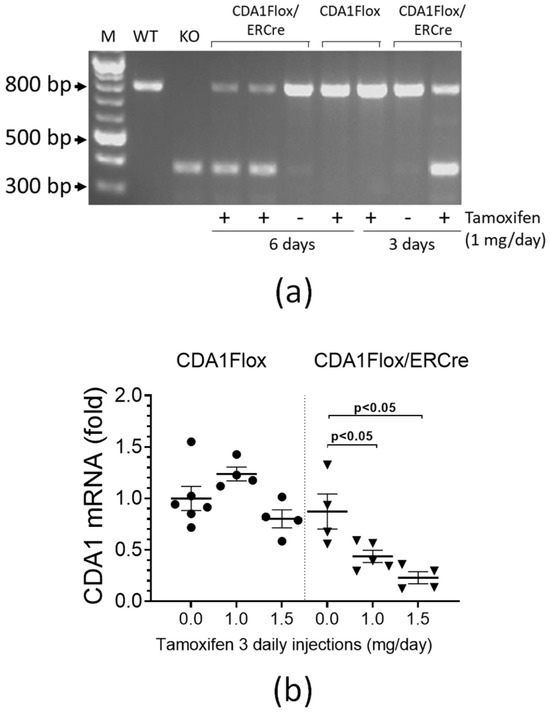 Male CDA1Flox/ERCre mice (10–12 weeks of age) were injected intraperitoneally with tamoxifen (Sigma-Aldrich, St. Louis, MO, USA; Cat. No. T5648) dissolved in corn oil (Sigma-Aldrich; Cat. No. C8267) at either 1.0 or 1.5 mg per mouse per day for 3–6 consecutive days. Littermate CDA1Flox mice without the transgenic ERCre served as genotype controls. Mice designated as vehicle controls were injected with corn oil alone. Mice were culled 3–14 days after their final injection, and organs were collected for genotyping and gene expression analysis to determine the efficiency of CDA1 deletion.