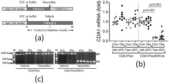 The CDA1Flox/ERCre mouse using a modified Cre-LoxP system [37] was generated in this study by crossing the CDA1Flox mouse [31] with the ERCre transgenic mouse [38,39], where deletion of exons 2–5 of the CDA1 gene flanked by the LoxP sites is inducible upon administration of tamoxifen. Since ERCre is expressed globally, tamoxifen administration should lead to global deletion of CDA1 at the selected time of induction, a model well representing the systemic targeting of CDA1 by a pharmacological approach. Both ERCre and CDA1Flox mice were used as genotype controls, which were confirmed to have a genotype equivalent to wild type CDA1 (WT) with or without administration of tamoxifen. The CDA1Flox/ERCre mice were shown to have the CDA1 gene efficiently deleted upon administration of tamoxifen, leading to a remarkable reduction of renal CDA1 mRNA levels in both non-diabetic and diabetic mice (Figure 2). Therefore, this model is appropriate to be used to examine the effect of targeting CDA1 on the progression of the established diabetic kidney disease. Indeed, induced inactivation of CDA1 for 5 weeks by a genetic approach in this model led to attenuation of renal parameters relevant to DKD. This is consistent with our previous findings using a pharmacological approach where STZ-diabetic mice were treated with a prototype inhibitor of CDA1, CHA-061, for 5 weeks during weeks 6–10 after diabetes induction [35]. However, CDA1 protein expression levels were not examined in this study due to lack of specific antibodies to detect mouse CDA1 in kidney tissues, which is considered to be a limitation of this study. The polyclonal antibodies we generated many years ago were raised against a human CDA1 immunogen [11], which did not work on mouse kidney tissues.