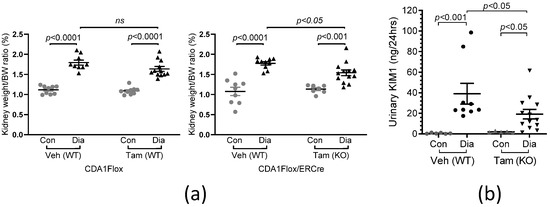 Diabetes-associated kidney hypertrophy and tubular injury are attenuated in mice with induced deletion of CDA1. (a) Kidney weight/body weight (BW) ratio (%) of individual mice and group mean ± SD at the end point are shown for both non-diabetic control (Con) and STZ-induced diabetic (Dia) mice of CDA1Flox (left panel) and CDA1Flox/ERCre (right panel) strains. At week 5, after induction of diabetes, these mice were treated with either vehicle (Veh) or tamoxifen (Tam), as described in the Methods. (b) Urinary KIM1 was measured in non-diabetic control (Con) and diabetic (Dia) CDA1Flox/ERCre mice at the end point. Individual values (ng/24 h) and group mean ± SEM are shown. p values between two groups (Mann–Whitney test) are shown. ns: statistically non-significant.