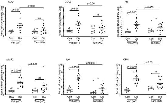 Diabetes-associated increases in renal mRNA levels of profibrotic and proinflammatory genes are attenuated in CDA1Flox/ERCre mice with induced deletion of CDA1. Renal mRNA levels of collagens I (COL1), III (COL3), fibronectin (FN), matrix metalloprotease 2 (MMP2), interleukin 6 (IL6) and osteopontin (OPN) were determined by qRT-PCR and are shown as individual values in each group, along with group mean ± SEM for CDA1Flox/ERCre mice, including non-diabetic control (Con) and diabetic mice receiving either vehicle (Veh) or tamoxifen (Tam), with the resultant genotype of either CDA1 wildtype (WT) or knockout (KO) indicated. p values are shown. ns: statistically non-significant.