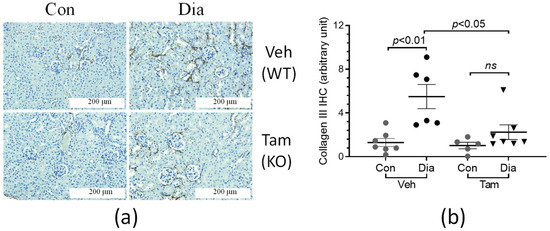 Diabetes-associated increase in renal collagen III accumulation is attenuated in CDA1Flox/ERCre mice with CDA1 deletion. (a) Representative microscopical images of immunohistochemical (IHC) staining of collagen III (brown color) are shown from non-diabetic control (Con) and diabetic (Dia) mice treated with either vehicle (Veh), hence having a wildtype CDA1 genotype (WT), or tamoxifen (Tam,) leading to CDA1 gene knockout (KO). (b) IHC staining signals were quantified by Image-Pro Plus software, Version 7.0 and arbitrary units are shown for individual values and group mean ± SEM. p values between specified groups are shown. ns: statistically non-significant.