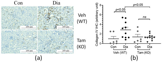 Diabetes-associated increase in renal collagen IV accumulation is attenuated in CDA1Flox/ERCre mice with CDA1 deletion. (a) Representative microscopical images of immunohistochemical (IHC) staining of collagen IV (brown color) are shown from non-diabetic control (Con) and diabetic (Dia) mice treated with either vehicle (Veh), hence having a wildtype CDA1 genotype (WT), or tamoxifen (Tam), leading to CDA1 gene knockout (KO). (b) IHC staining signals were quantified by Image-Pro Plus software, Version 7.0 and arbitrary units are shown for individual values and group mean ± SEM. p values between specified groups are shown. ns: statistically non-significant.