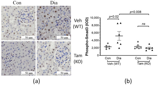 - Wang, A.; Ziyadeh, F.N.; Lee, E.Y.; Pyagay, P.E.; Sung, S.H.; Sheardown, S.A.; Laping, N.J.; Chen, S. Interference with TGF-beta signaling by Smad3-knockout in mice limits diabetic glomerulosclerosis without affecting albuminuria. Am. J. Physiol. Ren. Physiol. 2007, 293, F1657–F1665. [Google Scholar] [CrossRef] [PubMed]
