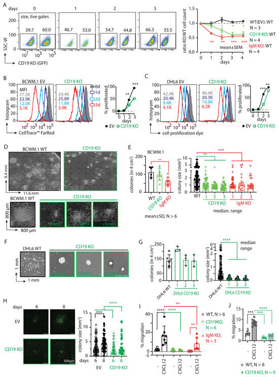 We found that CD19 KO cells were significantly outcompeted by wildtype (WT) cells in coculture assays (Figure 1A), indicating the necessity of CD19 for maintaining cell viability under competitive conditions. This was further evidenced by the reduced number and size of colonies formed by CD19 KO cells in CFC assays (Figure 1B–E). Apart from growth retardation, the CD19 KO cells showed no CXCL12-induced migration, highlighting the critical role of CD19 in maintaining B-cell lymphoma viability and mobility (Figure 1F–H). Additionally, treatment with anti-CD19 mAbs increased migration. However, the increase was largely dependent on the mAbs’ binding specificity and clonotypes, underscoring the complex impacts of targeting CD19, which can potentially promote lymphoma cell growth under certain conditions.