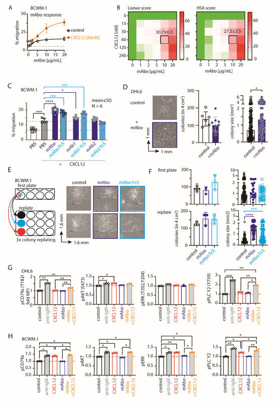 Next, we performed migration assays on BCWM.1 and DHL6 cells with varying dosages from 1 to 20 µg/mL of mAbo (Figure 2A and Figure S3E). The dose-dependent increment in CXCL12-induced migrations suggests a role for activated CD19 signaling crosstalk with CXCR4 signaling. In order to determine the optimum commination, we analyzed the combinatorial dose-dependent migration response of BCWM.1 cells using variable dosages of mAbo and CXCL12, calculated the synergy matrix using the highest single agent (HSA) model, and linearized the additive effect of individual compounds by Loewe’s model (Figure 2B) [29]. As depicted in the Figure 2B heatmaps, both models demonstrate synergic interactions between mAbo and CXCL12 at higher doses of mAbo. Notably, scores > 10 and < −10 represent synergistic and antagonistic interactions, respectively [29,30]. In addition, we tested the same dosages of mAbo on CD19 KO cells, showing no enhancement in CXCL12-induced migration compared with the WT counterpart (Figure S3F). Unlike BCWM.1 cells, mAbo treatment led to less effective migration enhancement in DHL6 cells (Figure 2A and Figure S3E), corroborating with the restricted CXCR4 responsiveness observed in DLBCL cells [28]. Therefore, we selected the dosage combination of 10 µg/mL mAbo and 60 nM CXCL12, which corresponds to Loewe and HSA synergy scores in BCWM.1 cells at 30.7 ± 0.3 and 27.5 ± 3.5, respectively (Figure 2B). To compare the enhanced migration by mAbo, we used two other commercial humanized CD19 clones, mAb1 and mAb2 (see Section 4). The mAb1 clone effectively increased CXCL12-induced migration similar to our mAbo. In contrast, the mAb2 clone minimally affected the migration, suggesting differential activation responses through CD19 antibody clones (Figure 2C). Additionally, we tested the Fc silent (FcS) mutant versions of all these humanized mAbs to avoid aberrant Fc receptor (FcR)-mediated recruitment. In all cases, the FcS versions behaved similarly to the unmutated mAbs, thereby eliminating interference through FcR on the B cell surface. When tested on CD19 KO BCWM.1 cells, none of these mAbs altered CXCL12-induced migration (Figure S3G). In parallel to migration, we assessed the effect of mAbo on colony formation (Figure 2D,E). While DHL6 colony sizes significantly increased upon the addition of mAbo (Figure 2D), BCWM.1 colonies exhibited a trend toward increase only after 10 days (Figure 2E). Therefore, we replated the colonies to allow them to grow on a new surface, where the BCWM.1 colonies were found to significantly increase in size in response to mAbo treatment (Figure 2E). Notably, mAbo treatment did not affect the number of colonies, suggesting no impact on colony seeding or initiation. Instead, it led to enhanced proliferation and spreading, resulting in larger colonies.