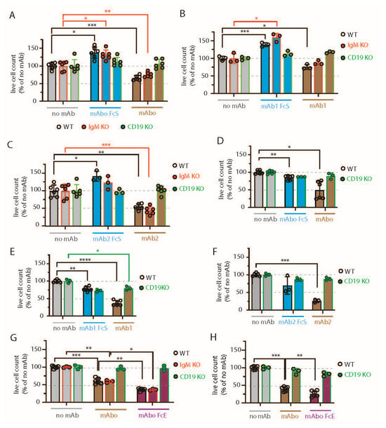 The clinical success of anti-CD19 mAbs relies on B cell-depleting cytolytic activity, specifically through antibody-dependent cell-mediated cytotoxicity (ADCC) in the presence of activated natural killer (NK) cells [32]. We therefore evaluated the efficacy of the CD19 mAbs in ADCC in the presence of IL-2 stimulated NK cells isolated from human peripheral blood (Figure 3 and Figure S4). We optimized an FACS-based quantitative analysis to determine the absolute live cell count and to distinguish cell types based on endogenous markers post ADCC assay (Figure S4A–E). Briefly, cell numbers were normalized to the number of live lymphoma cells obtained from the 4 h control experimental ADCC coculture of lymphoma and rhIL-2 activated NK cells without any mAb addition (no mAb, Figure S4C). Expectedly, we found that ADCC in the presence of mAbo reduced the WT BCWM.1 cells to 68.9 ± 7.2% in comparison with no mAb control, 100.4 ± 9.4% (Figure 3A and Figure S4C–E). Similarly, live IgM KO BCWM cells were reduced from 108.7 ± 14.6% in the no mAb control to 81.6 ± 7.8% due to mAbo-induced ADCC. In contrast, CD19 KO cells remained unaffected by mAbo-induced ADCC in the presence of activated NK cells. Similarly, the mAboFcS treatment failed to kill any of the WT and KO BCWM.1 cells due to a lack of NK cell engagement through FcR (Figure 3A and Figure S4C,D). Interestingly, normalized percentages of living WT and IgM KO BCWM.1 cells treated with mAboFcS were increased to 143.6 ± 17% and 142.8 ± 15.4%, respectively. This result supports our hypothesis that the failure to ligate a cytotoxic NK cell could potentially increase the survival of lymphoma cells in the presence of CD19 mAbs. Notably, the absolute lymphoma cell counts decrease for all BCWM.1 and DHL6 cell types in the presence of activated NK cells in 4 h control experimental ADCC coculture without any mAb (Figure S4B,C,F). This systemic loss of cell survival under control experimental ADCC coculture is prevented by the addition mAboFcS treatments (Figure 3A and Figure S4F).