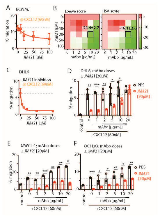 To down-modulate the CD19 mAb-induced activation of CXCR4 response, we then explored the combinatorial potential of CXCR4 inhibition to improve the mAb-induced ADCC. The endogenous peptide inhibitor of CXCR4 (EPI-X4) specifically antagonizes CXCR4 and is therefore a promising candidate for drug development for the treatment of CXCR4-dependent diseases [35]. Optimized EPI-X4 derivatives reduced the tumor burden in different cancer models, specifically, the survival of the WM cell line in immunocompromised mouse recipients [31,36,37]. We here tested the original EPI-X4 and an optimized version named EPI-X4 JM#21 (herein referred to as JM#21), which showed 1000-fold increased antagonistic activity compared with the WT peptide [37]. In addition, we included the small-molecule CXCR4 antagonist AMD3100 (Plerixafor), which is clinically approved for hematopoietic cell mobilization for autologous stem cell transplantation [38]. Previously, both EPI-X4 and JM#21 treatments were shown to inhibit basal survival signaling pathways by reducing ERK and AKT phosphorylation, with a subsequent loss of survival and apoptosis in WM cells [31]. Therefore, we first tested the dose response of EPI-X4 and JM#21 for 4 h of treatment, as described for the ADCC assay, and measured the cell survival after 12–18 h post removal of inhibitors (Figure S5A). The calculated IC50 for EPI-X4 and JM#21 treatments were 21.3 and 5.1 µM, respectively. Then, we tested the inhibitory effect of the same concentrations of EPI-X4 and JM#21 peptides on CXCL12-induced migration of BCWM.1 cells (Figure S5B). While >50 µM of EPI-X4 peptide was required to significantly reduce the CXCL12-induced migration to 13 ± 1.3%, only 20 µM of JM#21 reduced it to 10 ± 2.7% compared with PBS treatment resulting in 19.3 ± 0.7% migration. Of note, 10 µM JM#21 and AMD3100 and 200 µM of EPI-X4 were found to be effective for suppressing the CXCL12-induced migration of BCWM.1 cells overexpressing CXCR4 isoform 1, which caused an unusual increase in specific migration up to 80% [31]. Taken together, the JM#21 derivative showed potency over the original EPI-X4 [31,36,39]. As we intended to prevent the enhanced CXCR4 activation upon mAbo treatment in wildtype BCWM.1 cells expressing endogenous CXCR4, we analyzed the combinatorial dose-dependent migration response of mAbo at concentrations ranging from 1 to 20 µg/mL and of JM#21 ranging from 5 to 100 µM in the presence of 60 nM CXCL12 (Figure 4A,B). In both the Loewe and HSA models, JM#21 antagonized the mAbo-induced enhanced migration response, specifically at higher dosages (Figure 4B). Unlike BCWM.1 cells, CXCL12-induced migration of DHL6 cells was readily diminished by very low doses (<20 µM) of JM#21 (Figure 4A,C). For further analysis, we selected the dosage combination of 20 µM JM#21 and 10 µg/mL mAbo, which corresponds to Loewe and HSA synergy scores in BCWM.1 cells at −24.4 ± 2.7 and −16.1 ± 2.6, respectively (Figure 4B). We evaluated a linear combinatorial effect of mAbo dosages in the presence and absence of 20 µM JM#21 at 60 nM CXCL12, revealing a significant retardation effect of JM#21 across various mAbo dosages, except for the very high dose of 20 µg/mL (Figure 4D). Similarly, we examined the linear combinatorial effect of mAbo dosages in the presence of 20 µM JM#21 on CXCL12-induced migration in MWCL-1 and OCI-Ly3 cells (Figure 4E,F). Notably, MWCL-1 and OCI-Ly3 cells are derived from the monoallelic del17p13 karyotype WM and activated B cell (ABC) type DLBCL, respectively [40,41]. These results show the general potency of JM#21 on other WM and DLBCL cell types.