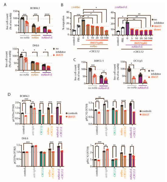 To this end, we tested the effect of JM#21 on the mAboFcE-induced ADCC on BCWM.1 and DHL6 cells and compared it with mAbo treatment (Figure 5A). The addition of 20 µM JM#21 significantly enhanced the efficacy of mAboFcE, causing decreases in the survival of BCWM.1 cells to 15.2 ± 2.8% from no inhibitor control 36.1 ± 3.8% (Figure 5A). In contrast, the survival in mAbo-induced ADCC was decreased only to 30.9 ± 4.1% from 40.7 ± 5.9%. The survival of DHL6 cells in ADCC assays with mAbo and mAboFcE in the presence and absence of 20 µM JM#21 was reduced to 47.7 ± 3.3% from control of 56.5 ± 2.7% and 24.2 ± 2.3% from 35.2 ± 4.3%, respectively. This result demonstrates the combinatorial efficacy of JM#21 and Fc-engineered CD19 mAb that surpasses the individual treatments. Next, we tested whether JM#21 prevents the CD19 mAb-induced enhancement of CXCL12-induced migration (Figure 5B). As shown before, mAbo treatment increased the CXCL12-induced migration of BCWM.1 cells (Figure 2C). This increased migration was inhibited by JM#21 in a dose-dependent manner significantly at doses > 10 µM (Figure 5B). Similarly, the enhanced CXCL12-induced migration caused by mAboFcE treatment was significantly blocked by JM#21 doses > 20 µM. In parallel, we tested mAboFcE’s combinatorial efficacy with EPI-X4 on CD19 KO BCWM.1 and DHL6 cells (Figure S6A,B). Expectedly, efficacy was seen only in WT and IgM KO cells, not in CD19 KO BCWM.1 (Figure S6A). Similarly, no additive effects were observed in CD19 KO DHL6 cells compared with their WT counterpart (Figure S6B). We also tested the efficacy of EPI-X4 to prevent the mAbo- and mAboFcE-induced increase in migration in BCWM.1 cells (Figure S6C). While a minimum of 50 µM EPI-X4 was required to significantly prevent mAbo-induced increased migration, above 10 µM, EPI-X4 effectively blocked the mAboFcE-induced enhanced migration. Thereafter, we tested the combinatorial efficacy of mAboFcE and JM#21 inducing ADCC in MWCL-1 and OCI-Ly3 cells (Figure 5C). The combination of mAboFcE and JM#21 was more effective for the OCI-Ly3 cells than the MWCL-1 cells. These data together showed JM#21 induced antagonism toward CD19-mediated migration and combinatorial efficacy in ADCC for other WM and DLBCL cells, namely, MWCL-1 and OCI-Ly3 (Figure 4E,F and Figure 5C). Together, these results show the efficacy of JM#21 over EPI-X4 against CD19 mAb-induced activation of CXCR4 signaling.