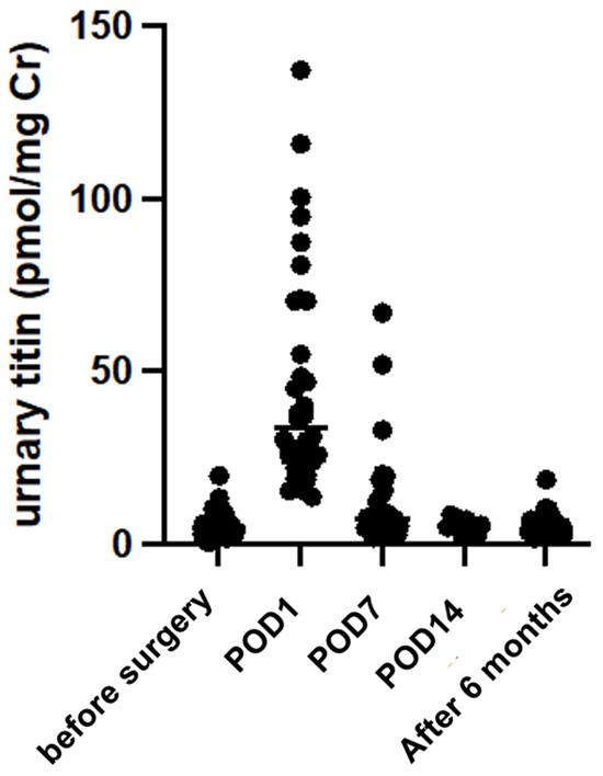 Kyomen, M.; Tatsumi, A.; Tsutsumi, R.; Izumi-Mishima, Y.; Hyodo, M.; Tanaka, E.; Iguchi, K.; Taura, K.; Terajima, H.; Honjo, S.; et al. Urinary Titin on the First Postoperative Day Predicts Long-Term Skeletal Muscle Loss in Patients with Gastroenterological Cancer. Int. J. Mol. Sci. 2025, 26, 2026. https://doi.org/10.3390/ijms26052026