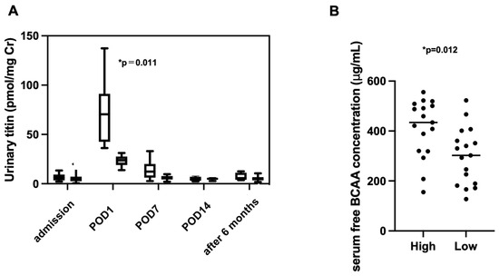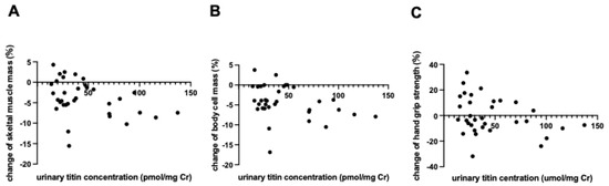 APA StyleKyomen, M., Tatsumi, A., Tsutsumi, R., Izumi-Mishima, Y., Hyodo, M., Tanaka, E., Iguchi, K., Taura, K., Terajima, H., Honjo, S., Hamasaki, A., Nomura, K., & Sakaue, H. (2025). Urinary Titin on the First Postoperative Day Predicts Long-Term Skeletal Muscle Loss in Patients with Gastroenterological Cancer. International Journal of Molecular Sciences, 26(5), 2026. https://doi.org/10.3390/ijms26052026