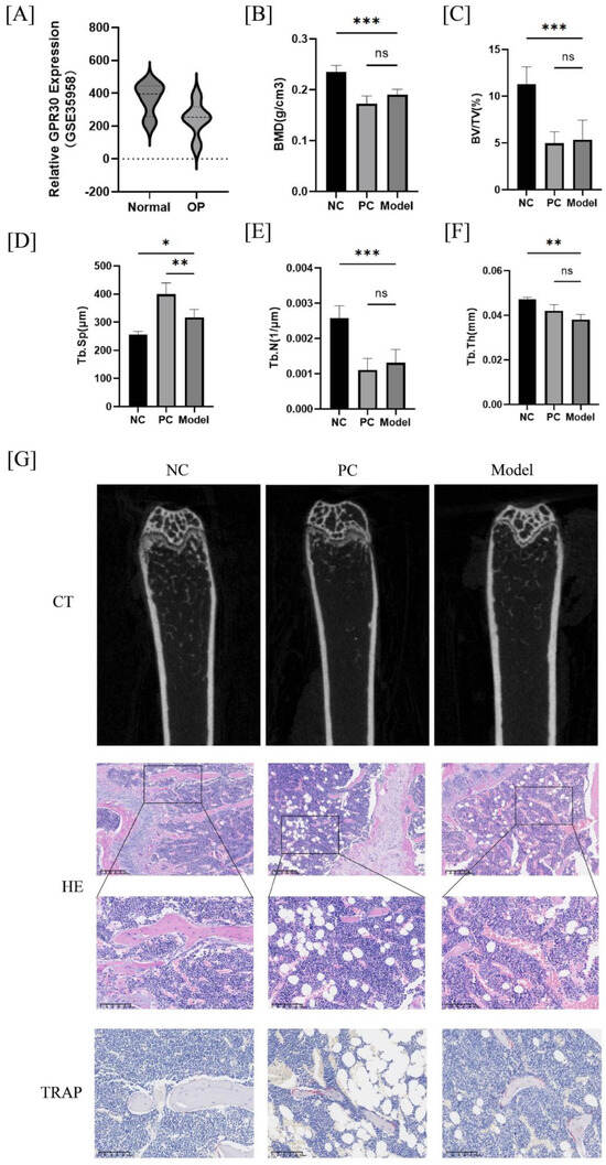 (A): Gene expression levels of GPR30 in BMSCs from osteoporotic (OP) patients compared to non-OP patients; with data sourced from GSE35958). (B–F): Bone volume ratio (BV/TV, %), bone mineral density (BMD), trabecular number (Tb.N), trabecular thickness (Tb.Th), and trabecular separation (Tb.Sp) for each group of mice. (G): CT images of mouse femurs, histological sections of mouse femoral tissue stained with hematoxylin and eosin (HE) (5× and 20× magnifications, The scales are 200 μm and 100 μm respectively), and histological sections stained for tartrate-resistant acid phosphatase (TRAP). * p < 0.05, ** p < 0.01, *** p < 0.001. n = 3 per group.
