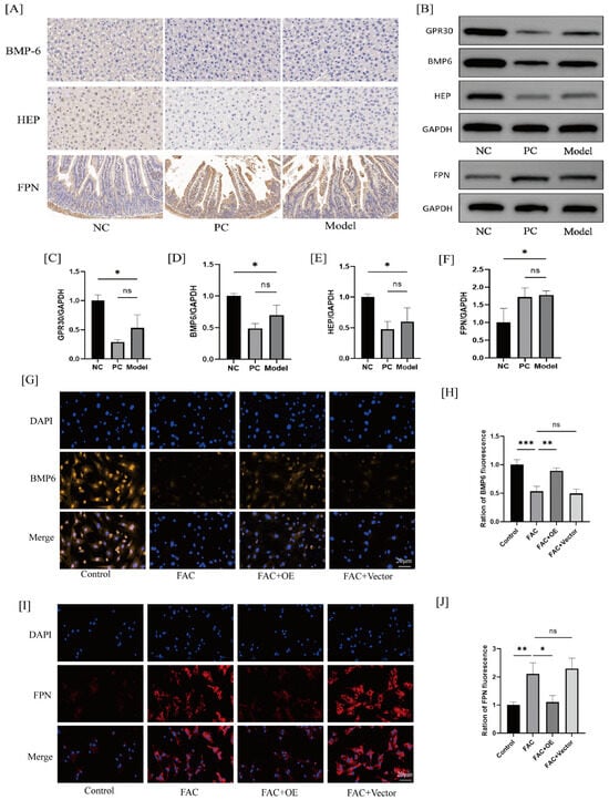 (A): Immunohistochemistry to detect BMP-6 and HEP in the liver, and FPN in the duodenum. The scale in the figure is 20 μm. (B–F): Western blot analysis of BMP-6, HEP, and FPN expression. (G–J): Immunofluorescence detection of BMP-6 and FPN expression. * p < 0.05, ** p < 0.01, *** p < 0.001. n = 3 for each group.