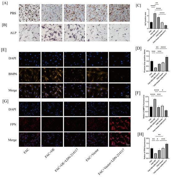(A,D): Prussian blue staining of cells and corresponding quantification. The scale is 100 μm. (B,C): ALP staining and quantification to assess osteogenic differentiation of cells. The scale is 50 μm. (E,F): Immunofluorescence detection of BMP-6 expression. (G,H): Immunofluorescence detection of FPN expression. * p < 0.05, ** p < 0.01, *** p < 0.001, **** p < 0.0001. n = 3 per group.