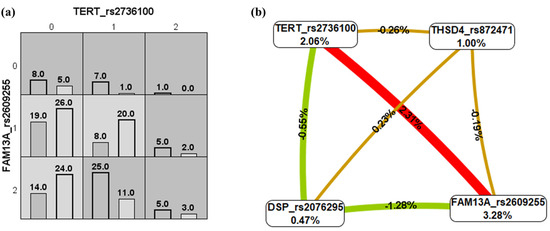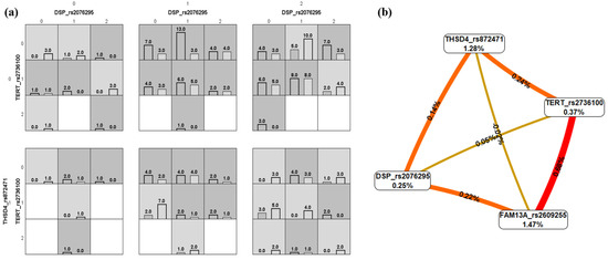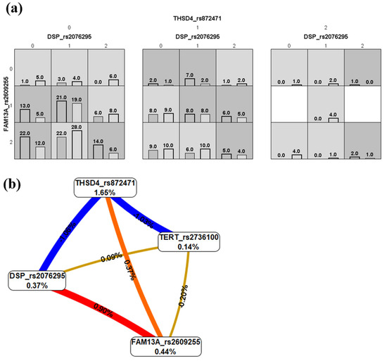 Multifactor dimensionality reduction analysis for mortality in COVID-19. (a) Bar charts showing the distributions of the genotypes’ combinations, including the DSP rs2076295, FAM13A rs2609255, and THSD4 rs872471 variants (for each graph, the left bars correspond to cases, and right bars to controls. 0, homozygous for the common allele; 1, heterozygous; 2, homozygous for the uncommon allele). High-risk genotypes can be observed in dark grey, and low-risk genotypes in light grey. (b) Gene–gene interaction graph. The red and orange colors indicate strong and moderate synergism; gold denotes no association or independence of selected loci effects; and blue indicates strong antagonism [29,30].