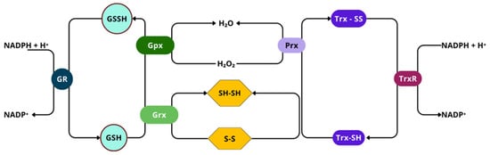 - Ren, X.; Zou, L.; Zhang, X.; Branco, V.; Wang, J.; Carvalho, C.; Holmgren, A.; Lu, J. Redox Signaling Mediated by Thioredoxin and Glutathione Systems in the Central Nervous System. Antioxid. Redox Signal. 2017, 27, 989–1010. [Google Scholar] [CrossRef] [PubMed]