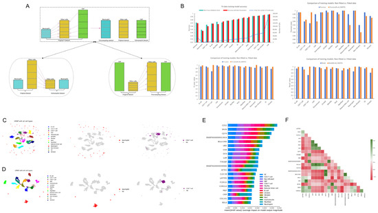 During model training, when the input consists of raw, unfitted data, the model is called the raw data model. After fitting the data with the number of B cells, the trained model is referred to as the initial model. When comparing the original data model with the initial model, in most cell types, the F1 score and recall of the fitted data were superior to those of the unfitted original data. We ultimately recognized the model trained with B cell counts as the initial model and saved the cell atlases of both the training and test sets under the condition of the highest accuracy (Figure 2C,D).