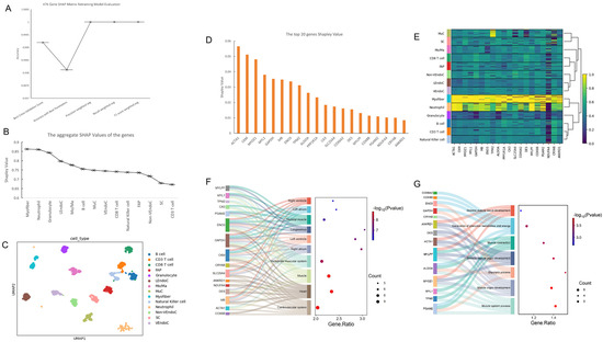The scientific nature of the training model for 476 co-expressed and specifically expressed genes in 14 types of cells. (A) Post SHAP interpretation of the initial optimal model, analysis of the top 500 SHAP-valued genes for co-expression, and specific expression across each cell type. (B) Assessment of accuracy following the training of models using matrices composed of 180 co-expressed genes, 296 cell-specific expressed genes, 476 genes from both categories, and 1161 unique genes on the optimal test set of the initial best model. (C) Single-cell map of skeletal muscle for 180 genes. (D) Single-cell map of skeletal muscle for 296 genes. (E) Single-cell map of skeletal muscle for 476 genes. (F) Single-cell map of skeletal muscle for 1161 genes. (G) Analysis of cellular composition for 476 genes.