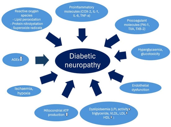 Diabetes mellitus is a complex metabolic disease that primarily affects carbohydrate metabolism but its impact on lipid and protein metabolic processes cannot be neglected. Compared to the healthy population, patients with diabetes have a higher risk of cardiovascular complications and mortality, particularly due to the elevated levels of detrimental metabolic parameters that contribute to atherosclerosis []. Cardiovascular autonomic neuropathy (CAN) and distal symmetric polyneuropathy (DSPN) are frequent complications of diabetes, mainly in individuals with prolonged periods of elevated glucose levels. In addition to hyperglycemia, several associated factors, including inflammation, oxidative stress, endothelial dysfunction, advanced glycated end products (AGEs), hypoxia, and ischemia, are implicated in their pathogenesis. Among these, the role of dyslipidemia is particularly significant (Figure 1) [,].