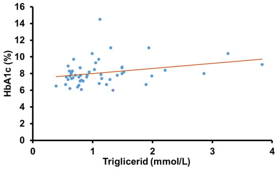 A clear positive correlation was found between HbA1c and fasting TG levels among our participants. Previous research demonstrated that TG does not impair, in a clinically significant manner, the performance of HbA1c measurement so the correlation is not due to a methodological problem []. It is published in the literature that elevated TG levels are associated with inadequate glycemic control in T2DM and it is explained mainly by the pathogenetic role of insulin resistance in these patients []. Hypertriglyceridemia observed in T1DM patients may be attributed to increased VLDL production secondary to relative insulin deficiency [] and decreased lipoprotein lipase activity in patients inadequately treated with insulin []. Both hyperglycemia and hyperlipidemia can exacerbate oxidative stress, endothelial dysfunction, and inflammation, leading to a multiplicity of cardiovascular risks in T1DM patients. Given the significant correlation between HbA1c and TG levels, either parameter may serve as a predictor of metabolic control in T1DM. Moreover, our findings highlight that elevated TG levels are not exclusively a sign of insulin resistance but are also associated with worse glycemic control in insulin-dependent patients.