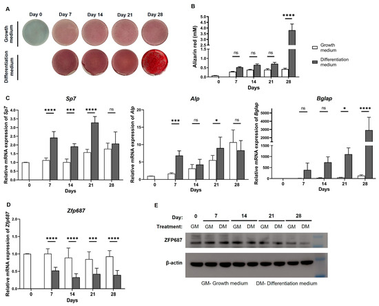Osteoblast differentiation of MC3T3-E1 cells under exposure to osteogenic differentiation media for 28 days: Mineralization, osteogenic markers, and Zfp687 expression. (A) Alizarin red S staining for mineralized nodules. (B) Quantification of calcium-bound alizarin red S by densitometry analysis at 550 nm. (C) Relative mRNA expression of Sp7, Alp, and Bglap at various time points during the differentiation. (D) Relative mRNA expression of Zfp687. (E) ZFP687 protein expression determined by Western blot. GM: growth medium; DM: differentiation medium. All graphical data represent the mean ± standard deviation (SD) of duplicates from three independent experiments (n = 6). Two-way ANOVA followed by Sidak’s multiple comparisons was used for statistical analysis, with significance determined at * p < 0.05; *** p < 0.001; and **** p < 0.0001, and ns indicating no statistical difference.