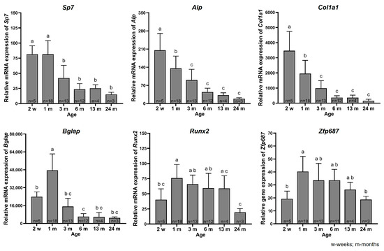Relative mRNA expression of bone markers in hindlimb long bones of C57BL/6J mice at different ages. The relative mRNA expression of Sp7, Alp, Col1a1, Bglap, Runx2, and Zfp687 was measured at neonatal (2 weeks), young (1 month), adult (3 months and 6 months), middle-age (13 months), and old (24 months) stages. Data are presented as the mean relative mRNA expression ± SD. One-way ANOVA followed by Tukey’s multiple comparisons was used for statistical analysis. Significant differences are indicated by distinct lowercase letters. w—weeks; m—months.