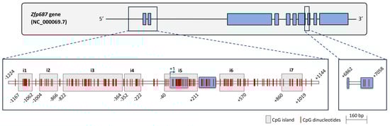 Bioinformatics analysis of CpG dinucleotides in mouse Zfp687. Schematic representation of CpG islands and CpG sites in Zfp687, spanning from −1224 to +1144 and from +6862 to +7058 relative to the transcription start site (+1). CpG islands and CpG dinucleotides are marked by light grey boxes and vertical red lines, respectively. Start/end positions are indicated in relation to the transcription start site. Zfp687 exons and introns are represented by blue boxes and horizontal lines, respectively.