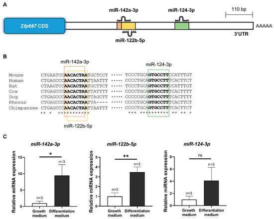 Prediction of miRNA binding sites in the 3′UTR of mouse Zfp687 and miRNA expression during MC3T3-E1 differentiation. (A) Schematic representation of potential miRNA binding sites in the 3′UTR of mouse Zfp687. (B) Alignment of miR-142a-3p, miR-124-3p, and miR-122b-5p binding sequences across vertebrates. Sequences in bold highlight the putative miRNA binding sites within the 3′UTR and asterisks (*) denote nucleotide positions that are 100% conserved. (C) Relative expression of miRNAs in MC3T3-E1 pre-osteoblasts (cultured in growth medium) and differentiating osteoblasts (cultured in differentiation medium for 14 days), normalized to U6 small RNA. Data are presented as the mean relative expression ± SD from three independent experiments (n = 3). The unpaired t-test was used for statistical analysis, with significance determined at * p < 0.05; ** p < 0.01. ns indicates no statistical difference.