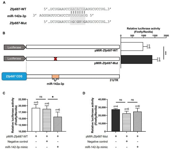 Functional analysis of miR-142a-3p binding in the Zfp687 3′UTR. (A) Nucleotide sequences of wildtype (WT) and site-directed mutated (Mut) binding sites for miR-142a-3p in the Zfp687 3′UTR. The seed sequence is highlighted in a grey shaded box. Mutations in the miR-142a-3p binding site of the 3′UTR are indicated in bold. (B) Relative luciferase activity of the WT (pMIR-Zfp687-WT) and mutated Zfp687 (pMIR-Zfp687-Mut) in MC3T3-E1 cells. Data are presented as the mean relative luciferase activity (ratio between Firefly luciferase of the 3′UTR construct and the Renilla luciferase of the internal control) ± SD. Statistical analysis was performed using the unpaired t-test with Welch’s correction, with significance determined at ** p < 0.01. (C,D) Relative luciferase activity of the WT or mutated Zfp687 in HEK-293 cells co-transfected with the miR-142-3p mimic or negative control. One-way ANOVA followed by Tukey’s multiple comparisons was used for statistical analysis, with significance determined at * p < 0.05. ns indicates no statistical difference.