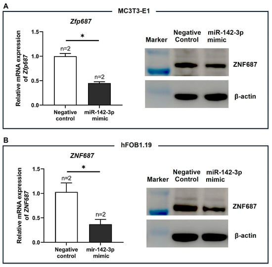 Effect of miR-142-3p on Zfp687/ZNF687 expression. Relative Zfp687/ZNF687 mRNA expression and protein levels in (A) MC3T3-E1 and (B) hFOB1.19 cells upon transfection of the miR-142-3p mimic or negative control. Bars represent the mean relative expression ± SD from two independent experiments (n = 2). An unpaired t-test was used for statistical analysis, with significance determined at * p < 0.05.