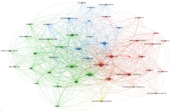 Bibliometric association between nanoplastics and endocrine functions. The figure shows the strength of links between the most relevant keywords looking for “nanoplastics” AND “endocrine” on PubMed. A total of 104 results were found against more than three thousand results from typing only “nanoplastics”, indicating that it is still an overlooked topic. In the green cluster, NPs are related specifically to oxidative stress and inflammation in mice and mammals. From reading the keywords, it can be seen that the main outcomes are linked to fertility, sperm and oocytes functionality, and ovary and testis integrity. The blue cluster focuses on generic “hormones” and on “testosterone”. These two words are also connected with “humans”, “endocrine disruptors”, and “pregnancy”, indicating that reproduction is still the main topic when NPs are associated with humans. If the environmental effects of NPs are considered, the red cluster shows that zebrafish is the principal animal model and that plastic leachates are the prevalent molecules in these types of studies. The yellow cluster composed of only one keyword, “environmental pollutants”, is connected to the green and red ones, confirming that the relation between environment and human hazards is a topic that remains poorly investigated.