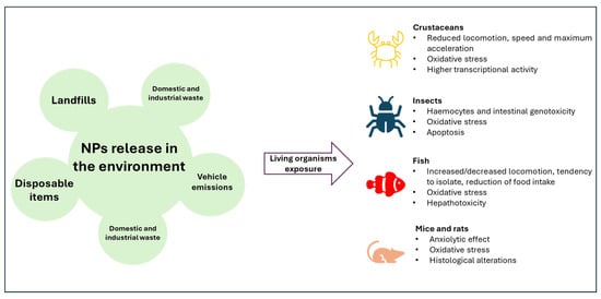 Plastic residues dispersed in the environment represent one of the biggest pollution-related issues of contemporary age. Environmental concentrations are increasing, and they have been found from urban to extreme areas such as glaciers and oceanic floor [,,]. Plastic residues undergo physical, chemical, and biological degradation, forming smaller fragments called macroplastics if bigger than 5 mm, microplastics (MPs) if the size is comprised between 100 nm and 5 mm, and nanoplastics (NPs) if smaller than 100 nm [,,,,]. Determining their amount in the environment can be challenging in the case of NPs. While MPs can be sampled using nets with an appropriate mesh diameter, NPs are too small to be trapped [,]. Advanced techniques like mass spectrometry or scanning electron microscopy (SEM) are required to characterize NPs []. Of course, considering the required skills and the expensiveness of these methods, they are not suitable for routinary analysis and screening. These limits also influence the choice of sizes and concentrations used in experiments that are consequently based on the few papers determining these parameters []. Chemical characterization is the starting point when studying nanomaterials and consequently NPs. Considering the technological limitations, it appears too complex to elaborate appropriate measures to mitigate the problem. Proper regulation is the most efficient way to achieve this goal, but it remains challenging due to the lack of scientific information. The heterogeneity of plastic polymers makes it difficult to summarize the toxic effects. Moreover, public perception is variable depending on cultural variables all over the globe. A unified global agreement is the ideal solution to synchronize worldwide legislation and align the negative outcomes connected to this topic. Additional research on innovative technologies to sample nanoplastics may help []. In addition to NPs alone, they can present chemicals bound to their surface or positive/negative charge influencing their kinetic properties and interactions with biological systems []. The study of the synergistic effect of compound-bond NPs is crucial to understanding the biological effects that all the pollutants to which humans are simultaneously exposed can cause. In fact, the expression “Trojan horse effect” precisely indicates the fact that some compounds take advantage of the higher ability that nanomaterials have in being absorbed by a biological organism [,]. In particular, hydrophobic organic compounds (polychlorinated biphenyls, polycyclic aromatic hydrocarbons, and other benzene ring derivatives), hydrophilic organic compounds (perfluorooctanesulfonate and perfluorooctanesulfonamide), and metals were found adsorbed bymicro- and nanoplastics []. In all of these papers, exposure has always been assessed with NPs and other compounds together, and to our knowledge, there are few works that have investigated the role of NPs alone. Indeed, the purpose of this perspective is to bring attention to the need to determine their effects alone. The endocrine tissues previously discussed are mainly the thyroid, the reproductive tissues, and behavior-related hormones, still considering NPs and other pollutants [,]. Few studies are focused on the direct effects of NPs on biological targets such as receptors and the consequent endocrine function. The major portion describes the effects of plastic leachates but not the role of the particles alone (Figure 1). From this perspective, we included some incisive examples of how NPs can induce toxic effects on major model organisms. Articles were selected from PubMed through December 2024 using the keywords “nanoplastics” AND “referred model organism” (to be replaced with models of interest). For length limitations, only a few representative articles were included, despite there being many more present in scientific literature. We prioritized the most recent papers, and we apologize to the colleagues whose work was not included in this paper.