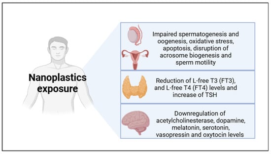 In zebrafish, no effects induced by NPs alone on thyroid function have been observed. NPs have been proven to exacerbate the effects of other endocrine disruptors such as microcystin-LR (cyanotoxin known for its effects on thyroid) [] and tris (1,3 dichloro-2-propyl) phosphate (TDCIPP), a thyrotoxic molecule []. Conversely, in exposed mice, PSNPs (1, 3, 6, and 10 mg/kg day) were demonstrated to induce a significant reduction in L-free T3 (FT3) and L-free T4 (FT4) levels and an increase in TSH []. Considering the relation between thyroid function and the hypothalamus, PSNP effects may disrupt this tissue both directly and indirectly based on the previously discussed evidence on behavior []. Figure 3 summarizes the main adverse effects on endocrine functions following NP exposure discussed in this perspective.