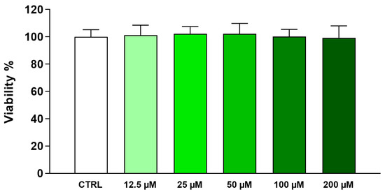 The first step of this study was to assess the safety profile of vicenin-2 in THP-1 monocytes to select the concentrations to be further employed. The exposure of THP-1 cells to increasing concentrations of vicenin-2 (12.5–200 µM) for 24 h did not exert any sign of toxicity, as assessed by MTT test, a widely used method to evaluate the mitochondrial capacity of living cells (Figure 1). Therefore, the two highest concentrations were employed in the following experiments (i.e., 100 and 200 µM).