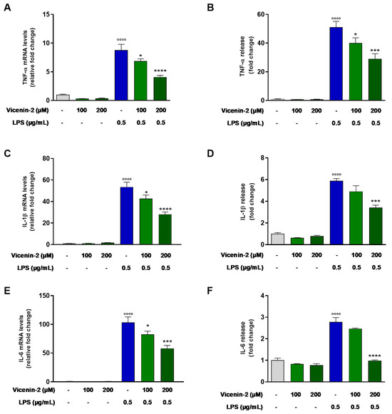 Effect of vicenin-2 on TNF-α, IL-1β, and IL-6 mRNA expression and release after LPS exposure of THP-1 cells. (A,C,E) Real-time PCR was employed to assess the levels of mRNA, and results are expressed as a relative fold change in exposed cells compared to those of untreated ones after normalization to β-actin. (B,D,F) Evaluation of secreted cytokines was carried out by ELISA in supernatants of THP-1 monocytes treated and untreated with vicenin-2 and LPS. Results are shown as fold change in cytokine release of exposed cells compared to that of untreated ones. (A–F) Data are expressed as the mean ± SEM of three experiments performed separately (n = 9). * p < 0.05, *** p < 0.001, and **** p < 0.0001 vs. LPS-exposed THP-1 cells (blue bar); °°°° p < 0.0001 vs. CTRL cells (light-gray bar).