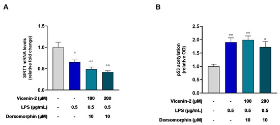 Blockage of the effect of vicenin-2 mediated by dorsomorphin on SIRT1 mRNA expression (A) and levels of acetylated p53 (B) after LPS exposure of THP-1 cells. (A) Real-time PCR was employed to assess the levels of mRNA, and results are expressed as a relative fold change in exposed cells compared to those of untreated ones after normalization to β-actin. (B) Relative protein levels of acetylated p53 were quantified by ELISA. Data are expressed as the mean ± SEM of three experiments performed separately in triplicate (n = 9). ° p < 0.05 and °° p < 0.01 vs. CTRL cells (light-gray bar).