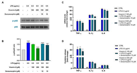Moreover, knowing that NF-κB is crucial for the expression of pro-inflammatory mediators [21], we assessed the expression and release of TNF-α, IL-1β, and IL-6 after the blockage of AMPK (Figure 7C,D). Notably, dorsomorphin abolished the protective effect of vicenin-2 against NF-κB activation induced by LPS. This resulted in the maintenance of elevated cytokine levels in cells pre-treated also with vicenin-2, similar to those detected in cells exposed to LPS alone, confirming the role of AMPK in the observed effects.
