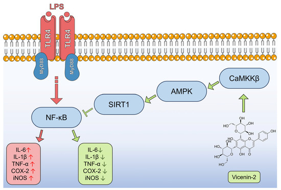 Putative mechanism underlying the anti-inflammatory effect of vicenin-2 in LPS-stressed THP-1 cells. Red arrows represent the cascade activated by LPS, while green arrows represent the potential path followed by vicenin-2 to hamper inflammation.