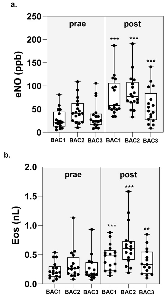 eNo (a) and eosinophils (b) before and 24 h after BACC. For statistical analysis, BAC pre- was compared to BAC post using the Wilcoxon test. ** p < 0.01, *** p < 0.001.