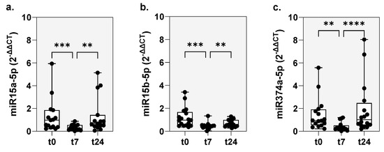 The comparison of the miRNAs, miR-15a-5p, miR-15b-5p and miR-374a-5p at time points t0, t7 and t24 demonstrated a significant downregulation of the expression rates (2−ΔΔCT) of all of the three miRNAs at time point t7, with a significant increase back to the initial level after 24 h (Figure 3). The miR-15a-5p expression before BAC (t0) was 0.98 (0.21–5.94), at t7 0.25 (0.2–0.86), p < 0.001 and at t24 0.67 (0.06–5.14), p < 0.01. Expression of miR-15b-5p before BAC (t0) was 0.97 (0.37–3.41), at t7 0.45 (0.2–1.34), p < 0.001 and at t24 0.57 (0.27–1.29), p < 0.01. The miR-374a-5p expression before BAC (t0) was 0.94 (0.22–5.58), at t7 0.29 (0.02–1.2), p < 0.01 and at t24 2.48 (0.2–8.05), p < 0.0001.