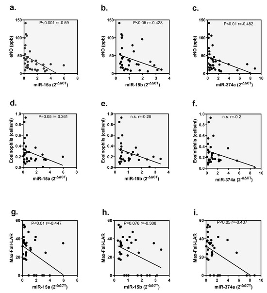 Correlations of miRNA expression with eNO, eosinophilia and max fall LAR. Correlations of miR-15a-5p, miR-15b-5p and miR-374a-5p with (a–c) eNO, (d–f) eosinophils and (g–i) max fall LAR are shown.