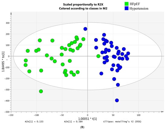 Differences in the concentrations of metabolites between HFpEF and hypertension groups. (A) two-dimensional PCA separation of the two studied groups; (B) differences between two groups using the OPLS-DA method; (C) S-plot of the model.
