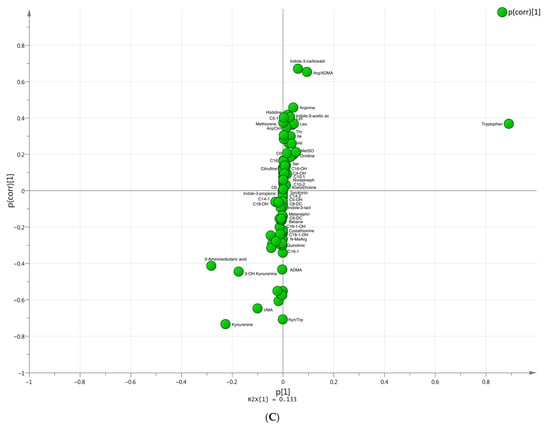 After performing targeted metabolomic analysis on 76 blood plasma samples, the data were analyzed using PCA; an unsupervised PCA model was assigned for a preliminary overview of the data as well as for outliers’ exclusion. Figure 1A represents the two-dimensional PCA separation of the two studied groups that did not get full separation of the analyzed objects. Further, in order to get a clearer presentation of the differences among two groups, the OPLS-DA analysis was performed. Figure 1B shows nearly clear separation of the analyzed groups with the predicted variance Q2 (Cum) and variance explained-R2X (Cum) equal to 0.58 and 0.92, respectively. To elucidate the most significant features (metabolites) that contributed to the model, the variable importance in the projection (VIP) scores were calculated for each metabolite. The metabolites with a VIP score equal to or higher than 1 were assigned as important. Additionally, we represented an S-plot, characterizing the relationship between loading vectors of the OPLS-DA model (Figure 1C). The loading vectors characterize the direction and strength of the relationship between the variables. The discriminant functions identify variables that mostly contribute to the separation between the desired groups. Variables that are located far from the origin of the plot are considered important. The list of these metabolites is represented in Table 3.