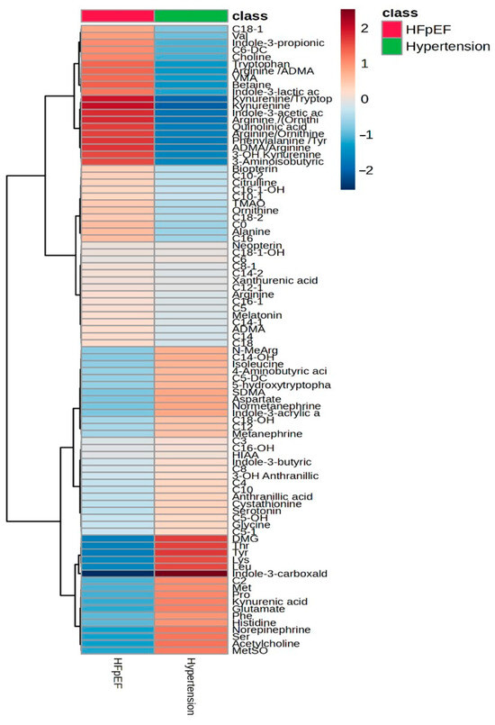 Differences in the concentrations of metabolites between HFpEF and hypertension groups using a heatmap.